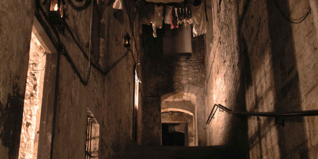 Je daalt af. De lucht wordt koeler. Zwaarder. Je ruikt vochtige steen. Je hoort je eigen voetstappen galmen. En dan zie je het: smalle straatjes. Oude deuren. Ramen uit de 17e eeuw.